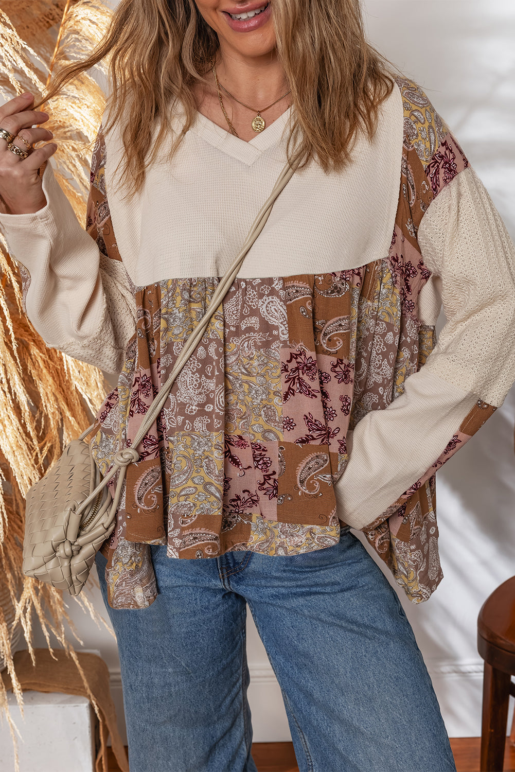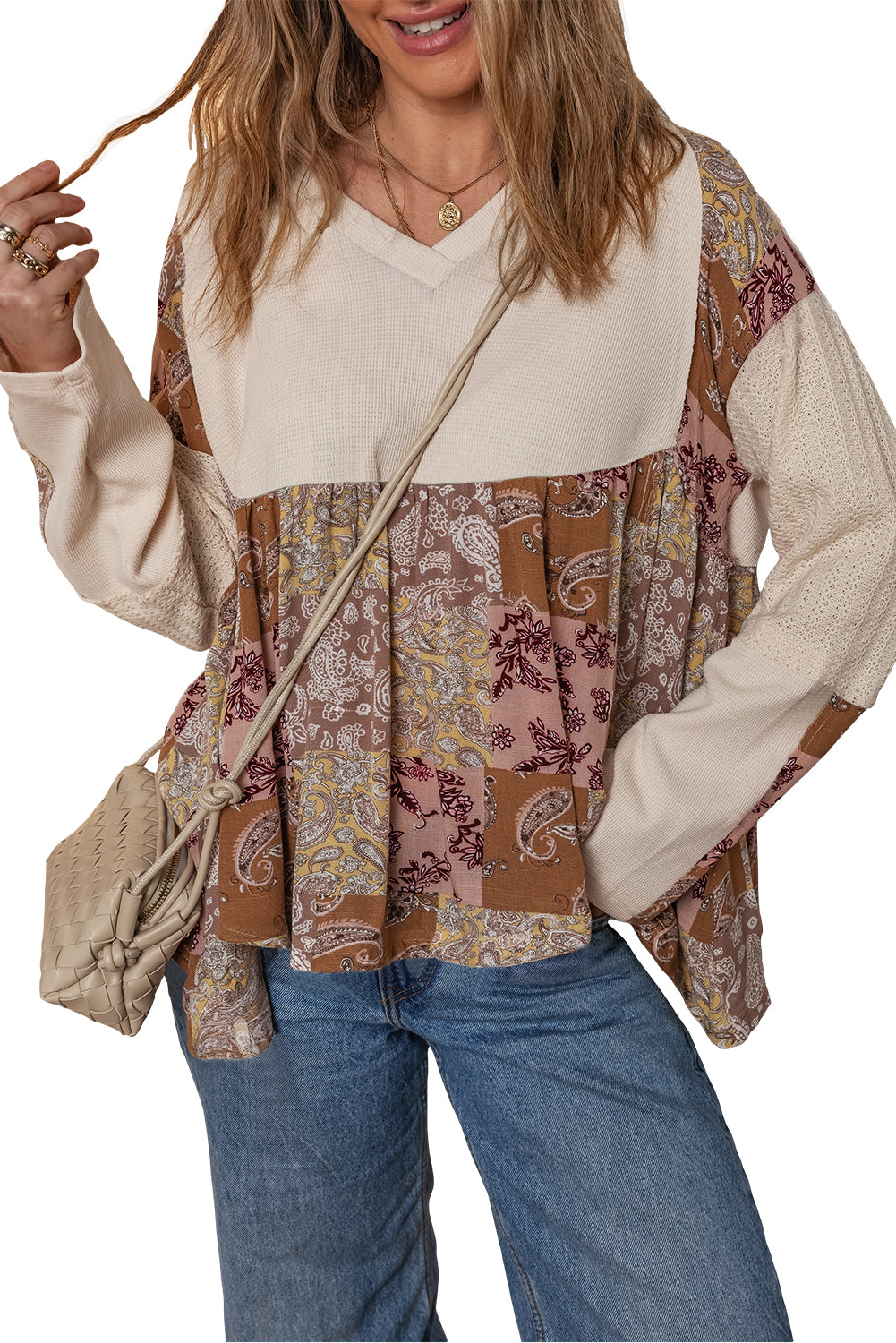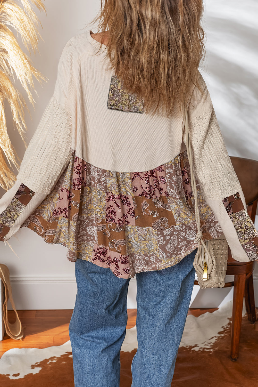 Beige Paisley Ethnic Print Waffle Patchwork Long Sleeve Loose Top