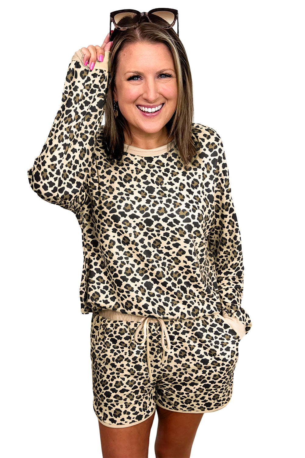 Brown Leopard Print Contrast Trim Two Piece Shorts Set