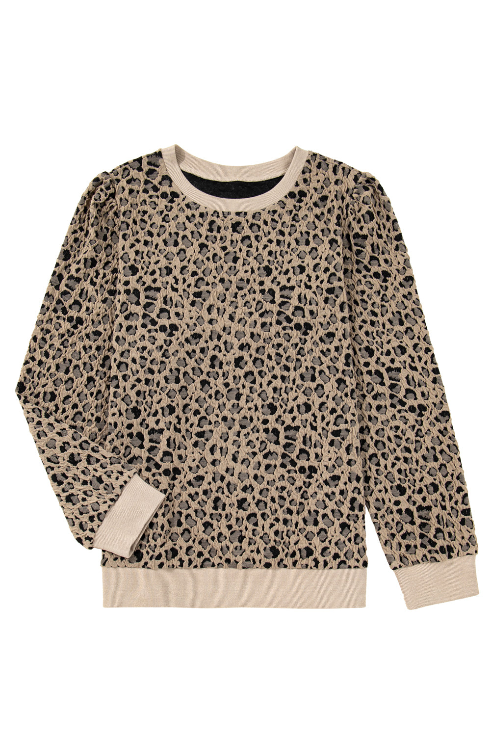 Khaki Leopard Textured Ribbed Trim Plus Size Long Sleeve Top