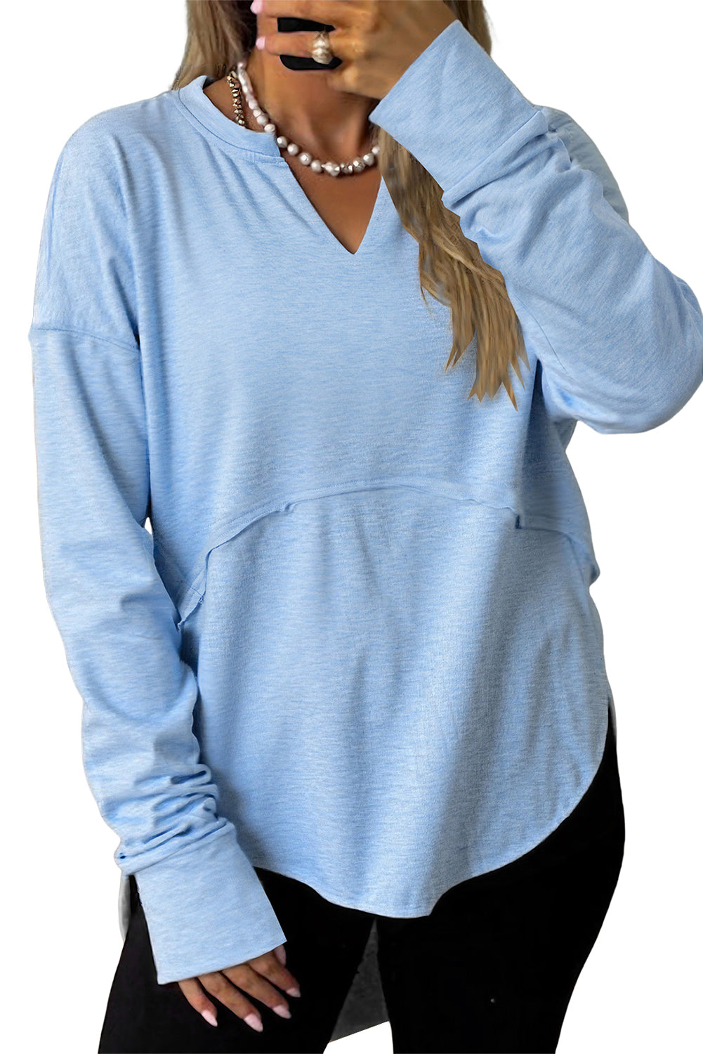 Myosotis Notched Neck Terry Raw Hem Long Sleeve Top
