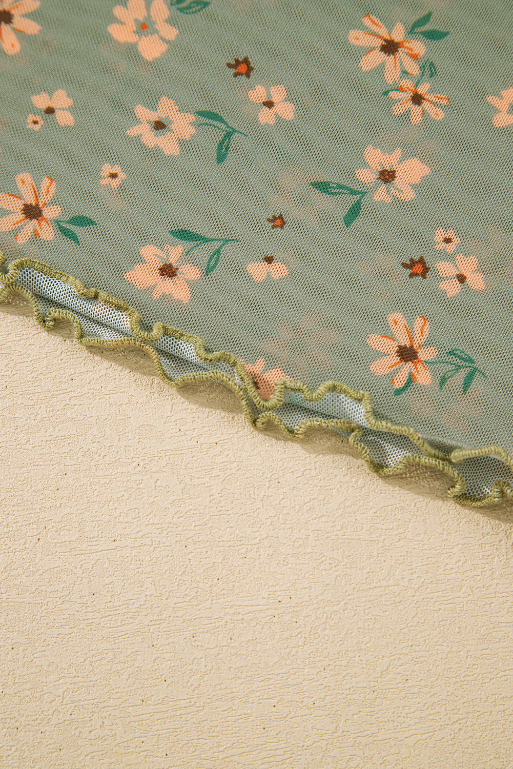 Sky Blue Floral Print Mesh Slim Fit Long Sleeve Top